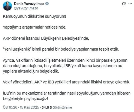 Yavuzyılmaz, parti olarak yürüttükleri incelemelerde yalnızca bu yapılanmanın değil, bazı vakıfların iktisadi işletmeleri üzerinden kurulan ikinci bir paralel mekanizmanın daha tespit edildiğini belirtti. Bu yapılar aracılığıyla belediyeye ait kamu kaynaklarının dışarıya aktarıldığını belgelediklerini ifade etti.