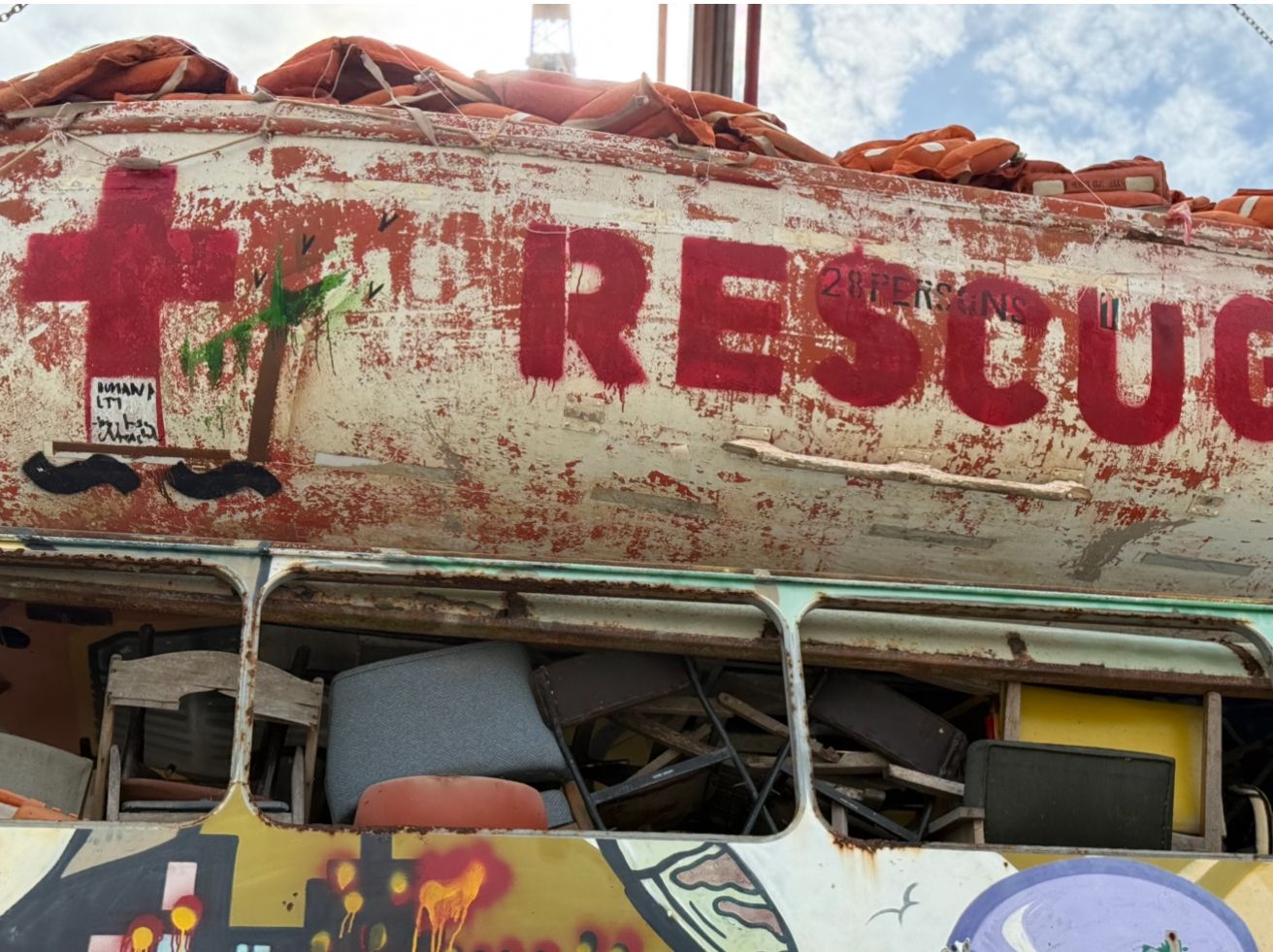 Sanatçı, Yunanistan’ın batırdığı “Rescue Boat”lardan (kurtarma botları) Alaçatıda, Altınkum kıyısına vuran mülteci çocuk elbiselerinden hareketle bu sembolü yaptığını ifade ediyor. Kızıl Haç’ın onlara mezer taşı olduğunu söyleyen sanatçı normalde mavi olması gereken “ ~ ~ “ işaretinin eserde siyah olmasının nedeninin “kara toprak” olduğunu söylüyor.